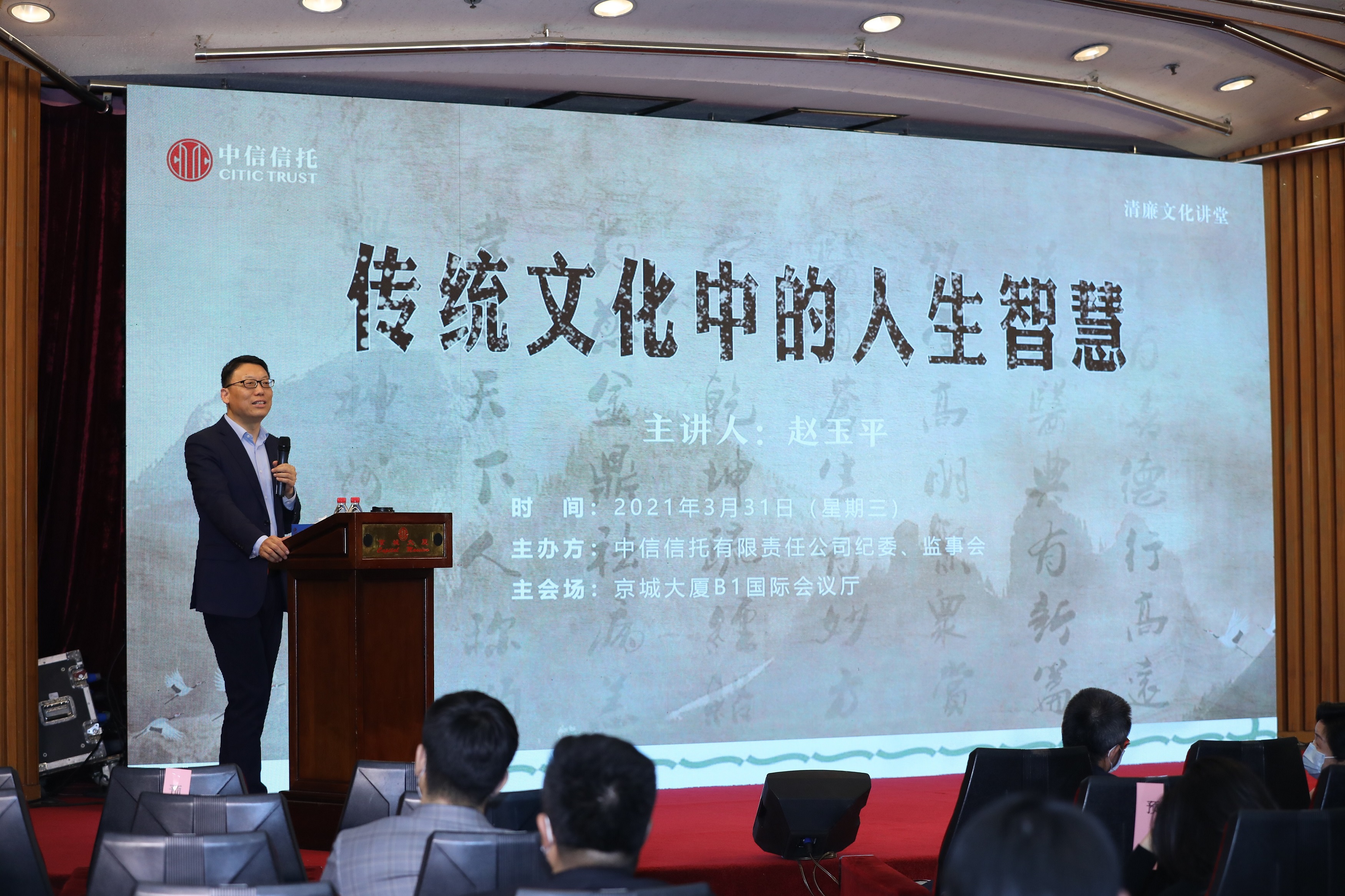 3月31日,中信信托举行2021年第2期“清廉文化讲堂”,央视《百家讲坛》主讲人、北京邮电大学特聘教授、清华北大总裁班法国里昂商学院特聘教授赵玉平以《传统文化中的人生智慧》为题作专题讲座;公司领导、中信信托及下属公司员工等共计200余人通过现场或者视频方式聆听。