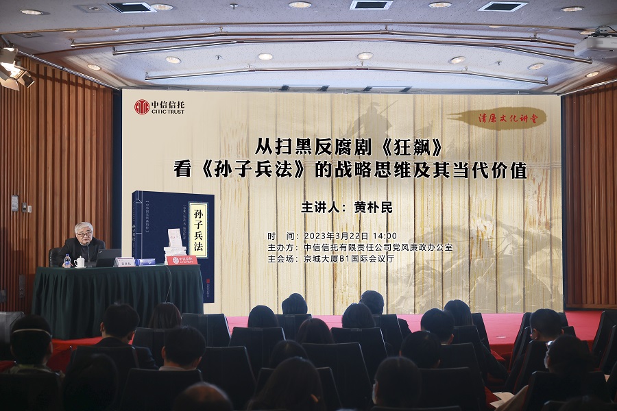 3月22日,中信信托举办2023年第一期清廉文化讲堂活动,邀请中国人民大学教授、中国孙子兵法研究会常务理事黄朴民围绕“从扫黑反腐剧《狂飙》看《孙子兵法》的战略思维及其当代价值”作辅导讲座。