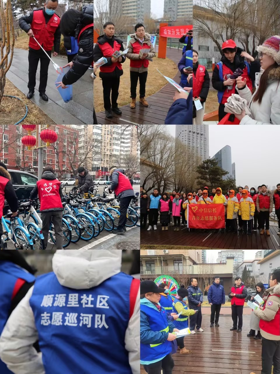 活动中,志愿者们身着统一志愿者服装,与左家庄街道的社工们一起团结协作,分成四个组开展志愿服务。他们有的支起了展板,进行垃圾分类宣传;有的手拿垃圾袋和夹子,沿着亮马河畔捡拾垃圾;有的来到新源南路,将马路边的共享单车摆放整齐;有的跟随顺源里社区志愿巡河队一道巡河、护理河道……虽然天空中不时飘落零星的雪花,但仍然无法阻挡公司青年志愿者们高涨的服务热情。