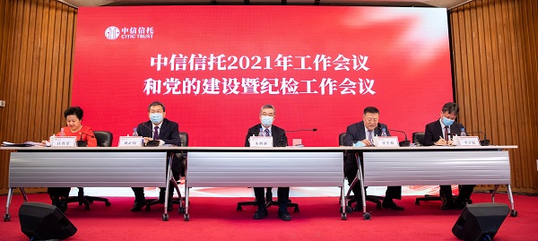 2月5日,中信信托2021年工作会议和党的建设暨纪检工作会议在京召开。中信集团党委书记、董事长朱鹤新,中信集团党委副书记、监事长任生俊莅临指导。中信集团党委委员、副总经理兼中信信托董事长刘正均,中信集团有关职能部门负责人,中信信托董事、监事参加会议。