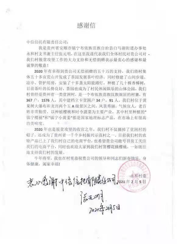 2021年2月,中信信托参与捐助的贵州省安顺市镇宁布依族苗族自治县白马湖街道办事处永和村实现脱贫摘帽,并入围贵州省乡村振兴示范村,村支书兼主任张元明代表全体村民特意发来感谢信,对公司在该村脱贫攻坚工作中给予的支持表达感谢。