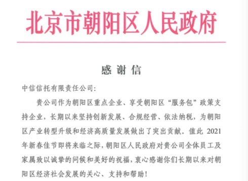 2月5日,由于长期以来坚持创新发展、合规经营,坚决履行依法纳税、服务实体的企业责任,中信信托受到北京市朝阳区人民政府的特别感谢,对公司在朝阳区产业转型和经济高质量发展中做出的突出贡献表示充分肯定。