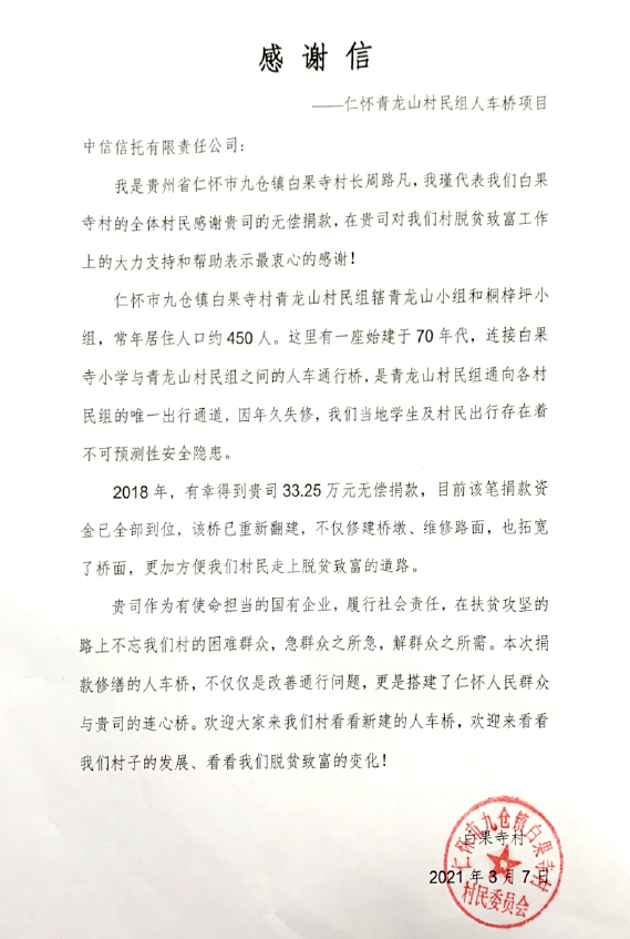 3月7日,在脱贫攻坚战全面胜利之际,仁怀市九仓镇白果寺村村长周路凡代表村民委员会寄来感谢信,感谢中信信托对当地脱贫致富工作上的支持和帮助。