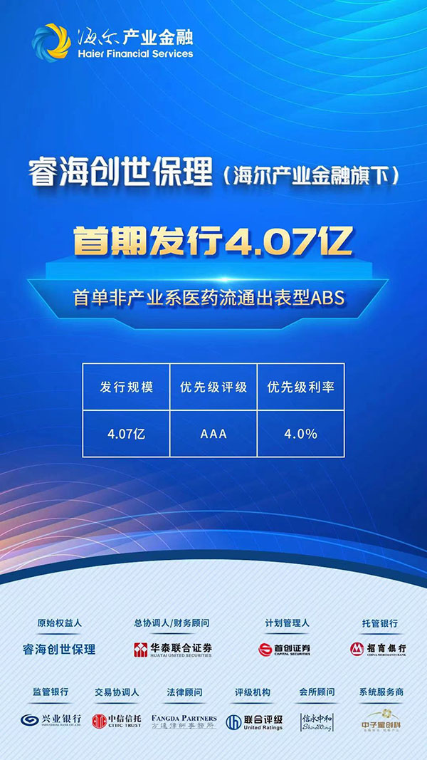 4月30日,由中信信托担任交易协调人的首单非产业系医药流通出表型ABS“海尔-睿海创世保理1期资产支持专项计划”在上海证券交易所成功发行。产品总规模4.07亿,评级AAA,优先级票面利率为4%。本项目有效提升了中信信托对实体经济和医疗行业的服务水平,助力落实国家战略、解决企业流动性难题和支持实体经济转型升级。