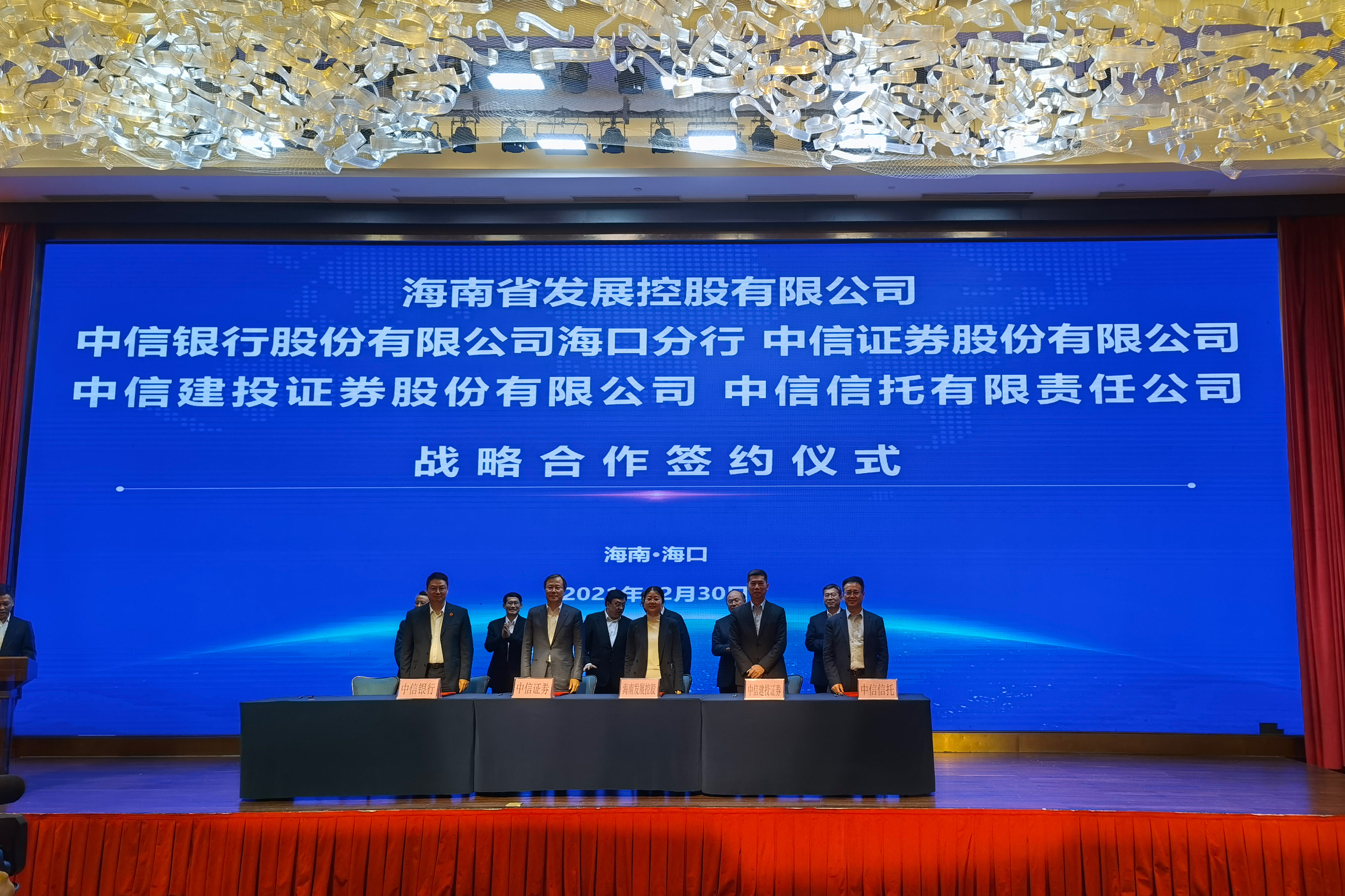 2021年12月30日,中信信托与海南发展控股战略合作协议签约仪式在海口举行。中信集团董事长朱鹤新、总经理奚国华、副总经理刘正均、中信信托副总经理蔡成维和海南省省长冯飞、常务副省长沈丹阳、副省长刘平治、省政府秘书长符宣朝等领导出席签约仪式。
