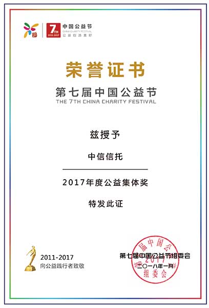 中信信托坚持“信行天下、信惠百姓”企业愿景,积极履行信托行业“八大责任”,以卓越的业绩和实际行动获评“第七届中国公益节2017年度公益集体奖”。