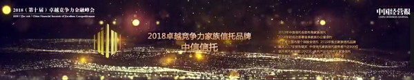 2018年12月11日,由中国经营报社、中国社会科学院联合主办的2018(第十届)卓越竞争力金融峰会在京隆重召开,在当晚举办的“中经公益之夜”暨第十届卓越竞争力金融机构评选颁奖晚宴上,中信信托荣获“2018卓越竞争力家族信托品牌”奖,资产管理部总经理王楠受邀出席颁奖典礼。