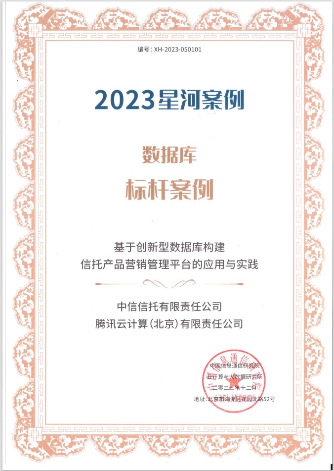 中信信托和腾讯云凭借《基于创新型数据库构建信托产品营销管理平台的应用与实践》课题成果,荣获数据库标杆案例奖,这说明中信信托在数据库应用方面的经验和水平得到了业界的广泛认可。