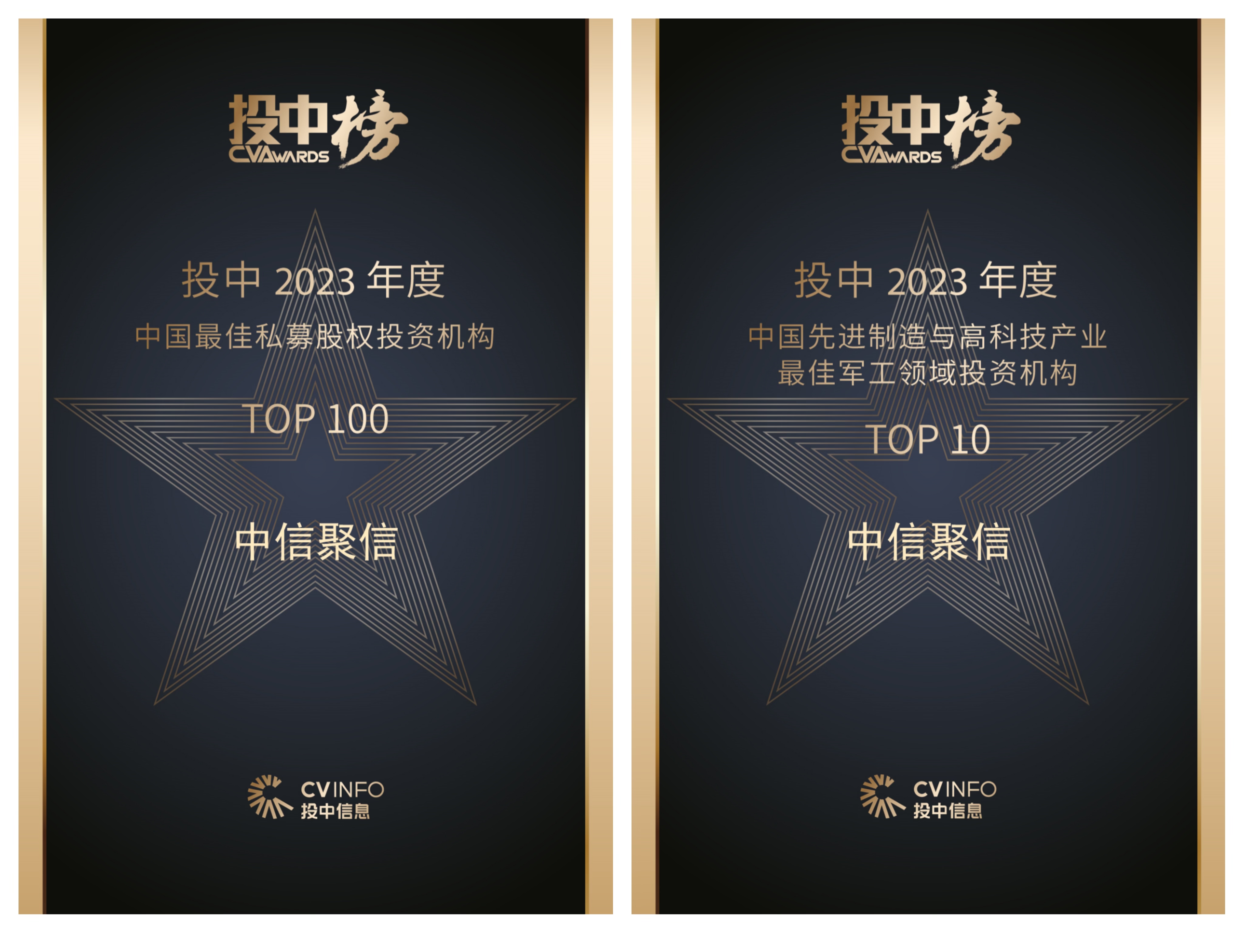 5月10日,“投中2023年度榜单”揭晓,中信信托所属全资股权投资平台——中信聚信(北京)资本管理有限公司凭借在私募股权投资领域及军工投资领域的稳健表现,荣获“中国最佳私募股权投资机构TOP100”及“中国先进制造与高科技产业最佳军工领域投资机构TOP10”两个行业重磅奖项,这是对中信聚信深入探索信托转型、奋力做好“科技金融”的支持与认可。