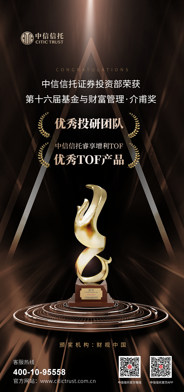 近日,由财视中国主办的“第十六届基金与财富管理·介甫奖”获奖名单揭晓,中信信托证券投资部荣获“优秀投研团队”奖,中信信托自主决策的“中信信托·睿享增利TOF金融投资集合资金信托计划”(以下简称睿享增利TOF)荣获“优秀TOF产品”奖。