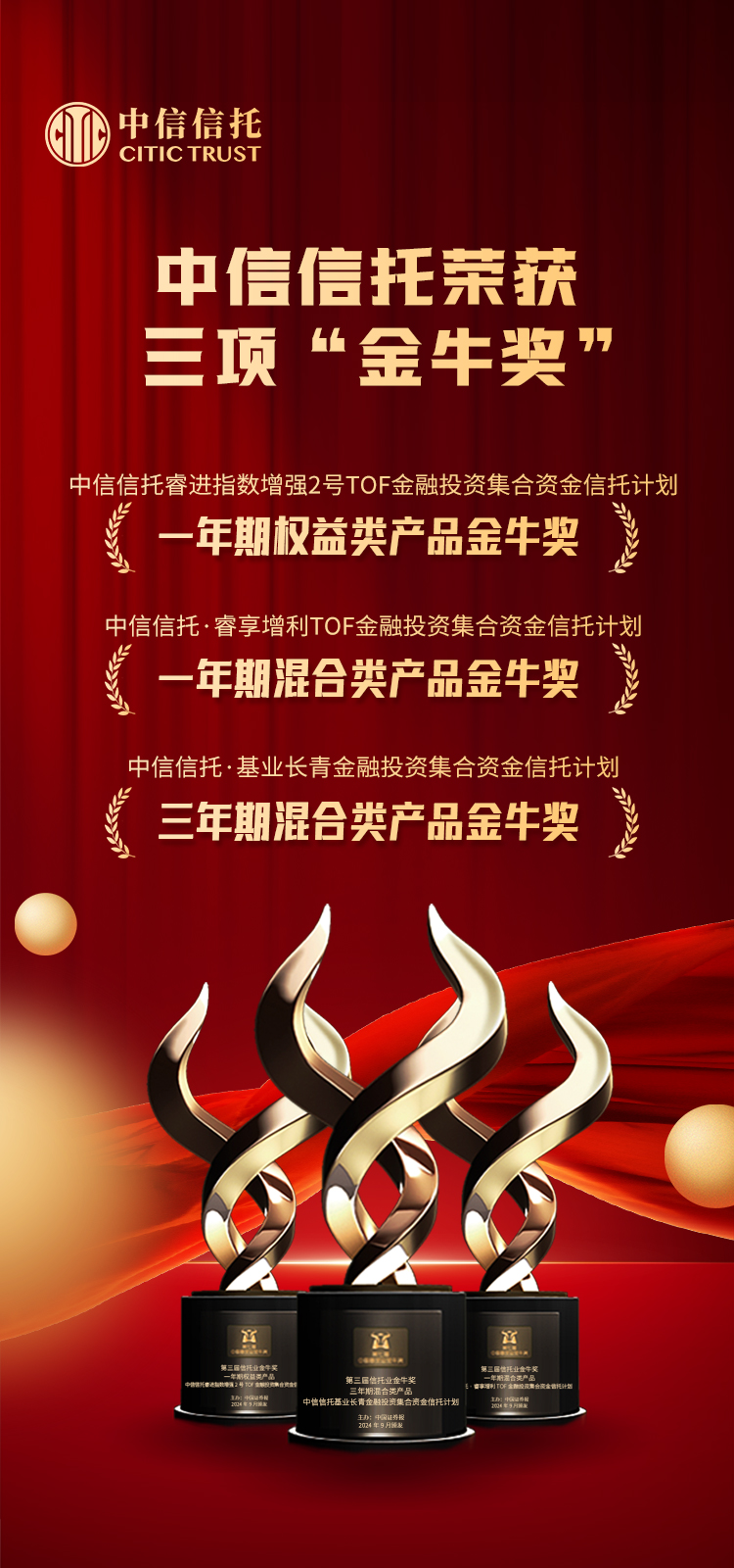 近日,由中国证券报主办的第三届“信托业金牛奖”榜单揭晓,中信信托再创佳绩,“中信信托睿进指数增强2号TOF金融投资集合资金信托计划”(以下简称睿进2号TOF)荣获“一年期权益类产品金牛奖”,“中信信托·睿享增利TOF金融投资集合资金信托计划”(以下简称睿享增利TOF)荣获“一年期混合类产品金牛奖”,“中信信托·基业长青金融投资集合资金信托计划”(以下简称基业长青)荣获“三年期混合类产品金牛奖”。