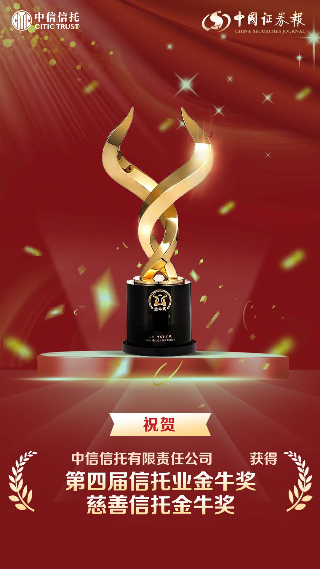 今年,恰逢中信信托深耕慈善信托业务的第十个年头。截至目前,公司已备案慈善信托项目20单,备案金额16.7亿元,涵盖扶贫济困、人才奖励、环境保护、教育支持、社区照顾、养老支持、医疗帮扶等各个领域。本次荣获慈善信托金牛奖,充分体现了市场、客户、研究机构和主流媒体等社会各界对中信信托长期以来不懈努力与取得成绩的认可。