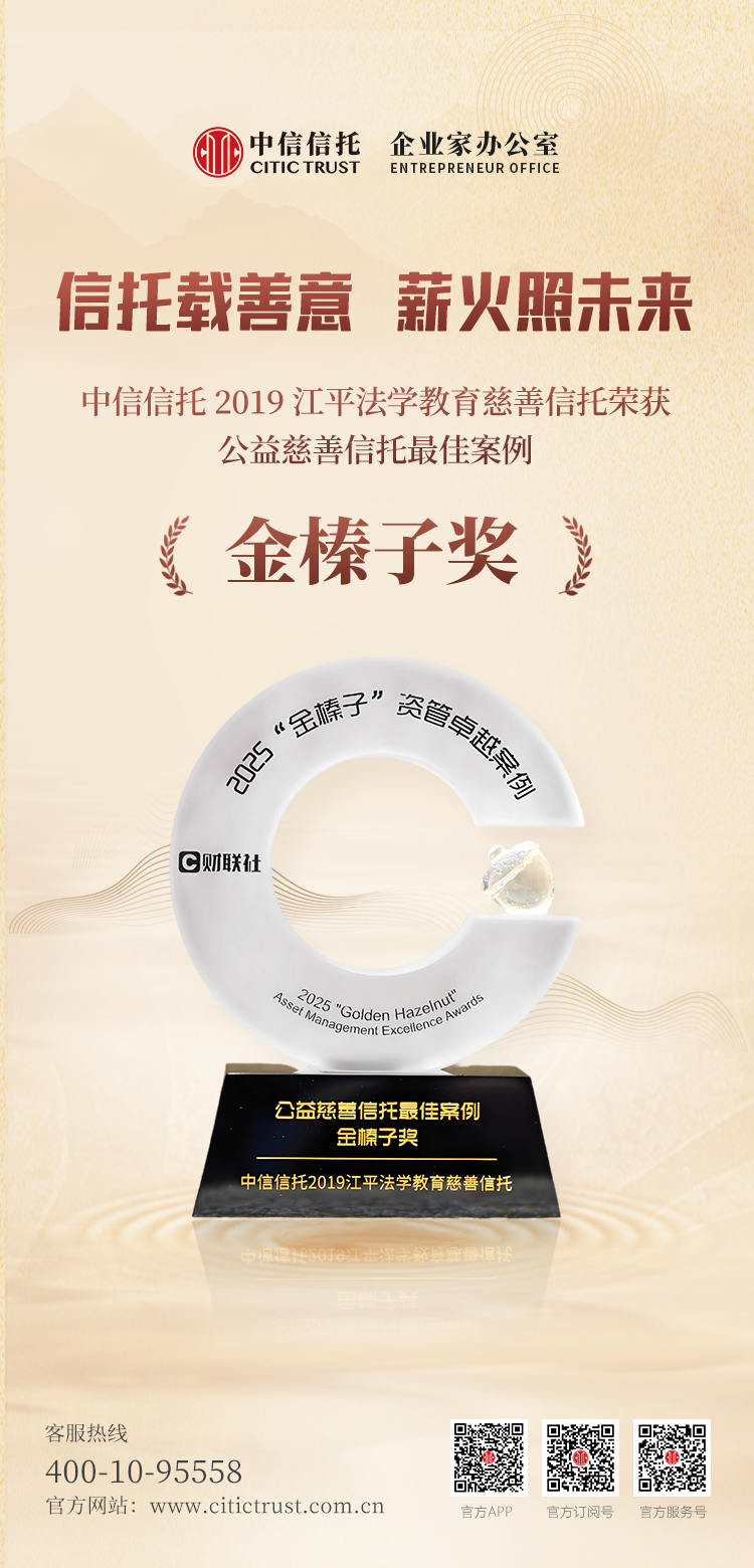 近日,在上海报业集团财联社主办的第三届“金榛子”资管机构卓越案例评选中,“中信信托2019江平法学教育慈善信托”荣获“公益慈善信托最佳案例金榛子奖”。