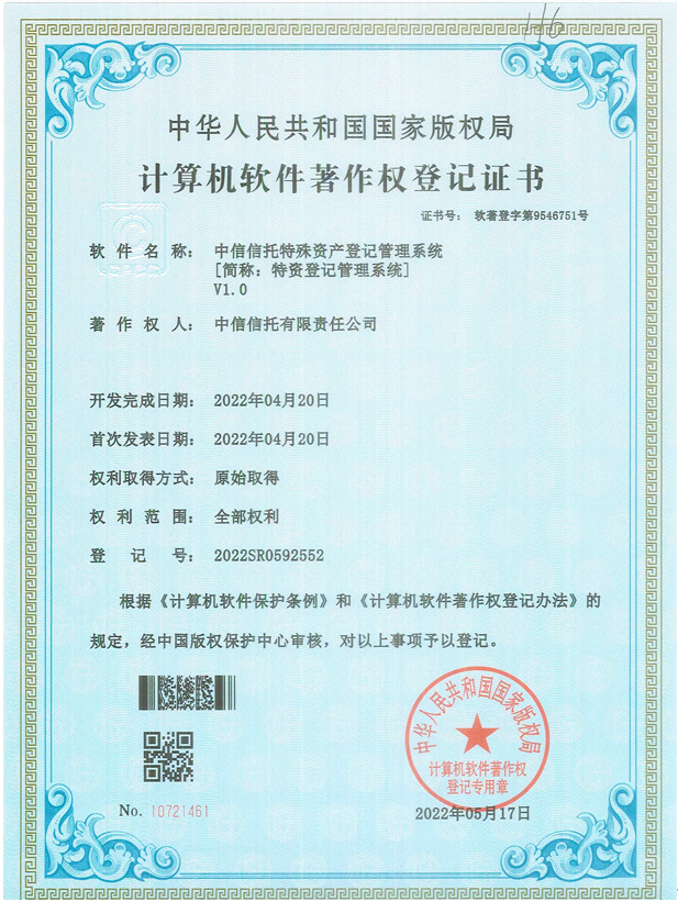 为了积极支持公司业务转型和特殊资产业务战略布局,为海航集团破产重整专项服务信托项目提供统一运营管理平台,中信信托在极短时间内,自主研发并上线了特资客户服务系统和特资登记管理系统,并分别获得国家版权局软件著作权证书。这是公司通过信息技术赋能业务转型的又一重要突破。