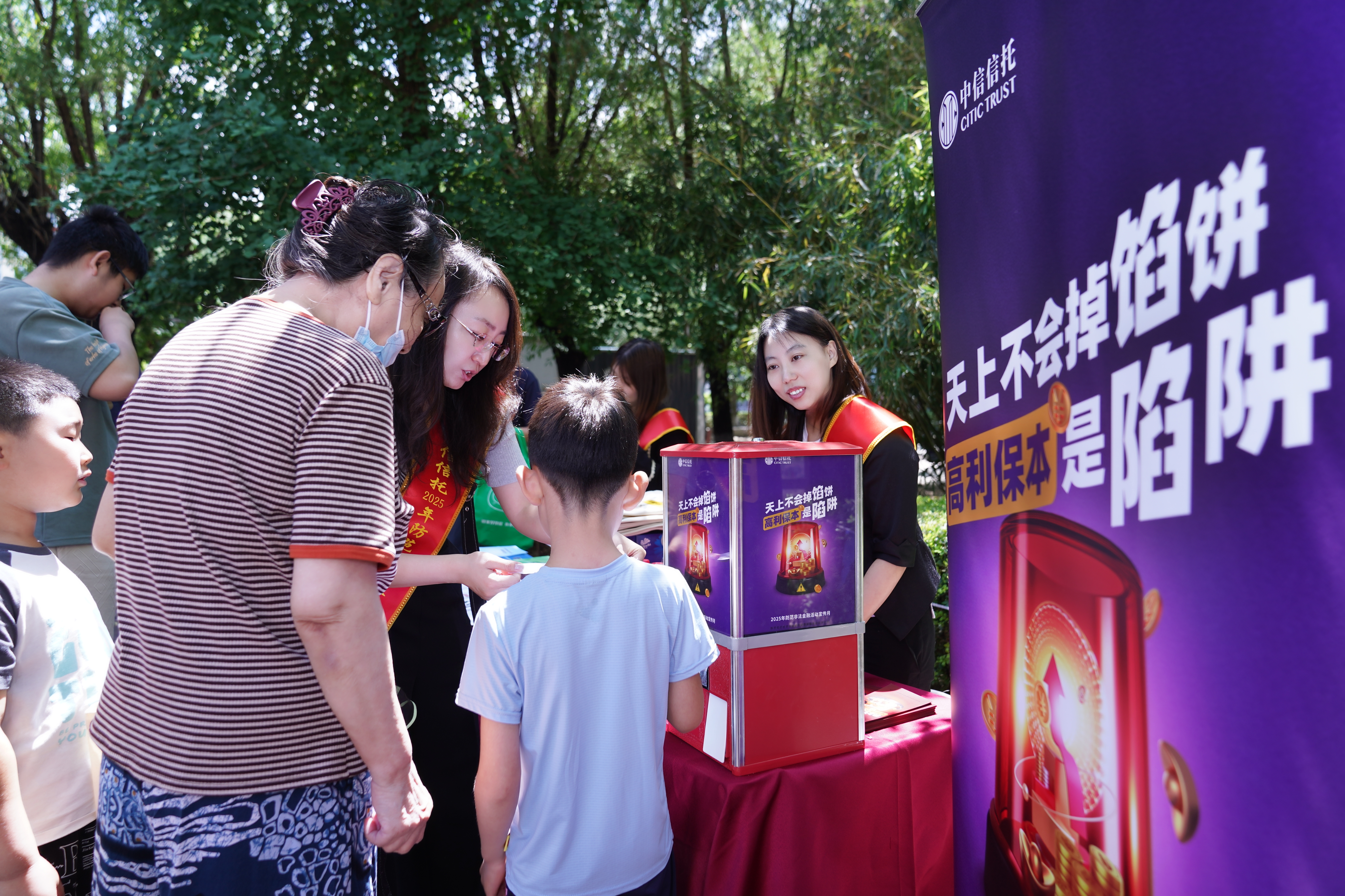 在北京市丰台区新奥洋房小区广场,中信信托宣教志愿者摆放金融知识宣传摊位,集中展示民间投融资中介、养老、市场零售、文旅等非法金融活动高发领域的消保宣教内容。志愿者通过通俗易懂的语言,结合真实案例,向居民讲解防范非法金融活动方法,揭示打着消费返利、公益慈善、高新科技等旗号的非法金融活动骗局,强化居民金融风险防范意识。