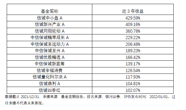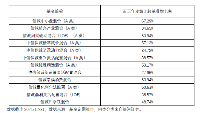 注5:截至2021年末,中信保诚基金12只主动权益型基金近3年收益率超过100%,分别为以下12只产品: