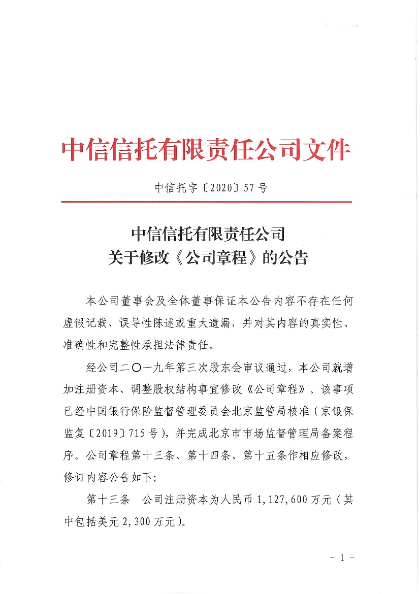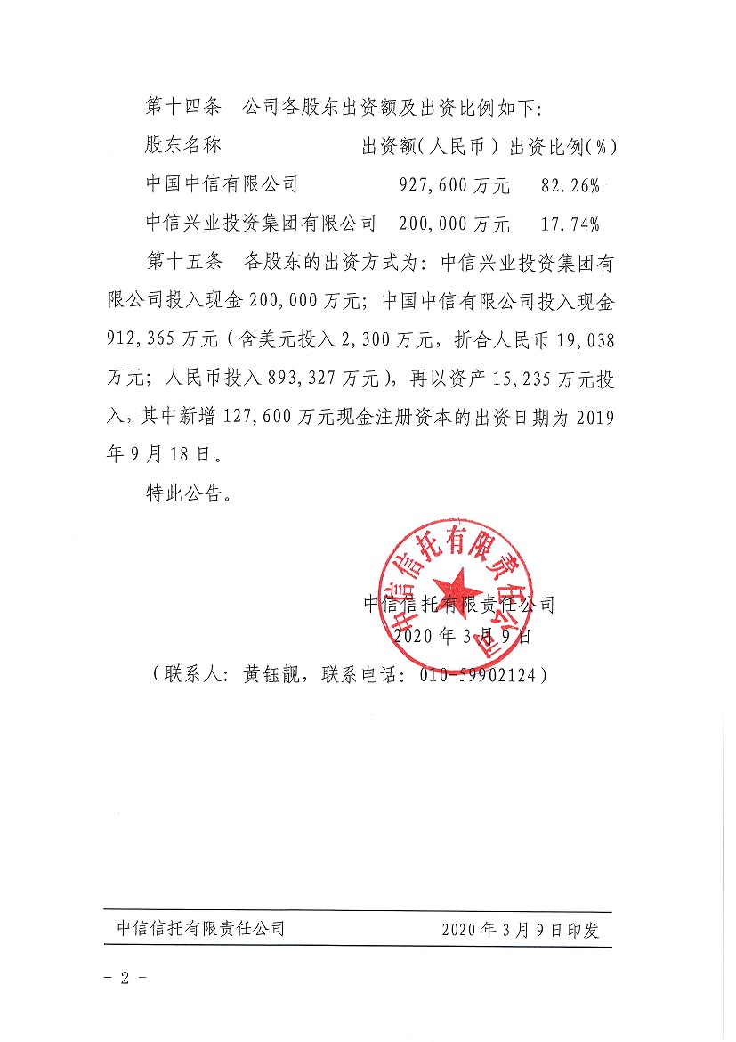 第十五条 各股东的出资方式为:中信兴业投资集团有限公司投入现金200,000万元;中国中信有限公司投入现金912,365万元(含美元投入2,300万元,折合人民币19,038万元;人民币投入893,327万元),再以资产15,235万元投入,其中新增127,600万元现金注册资本的出资日期为2019年9月18日。