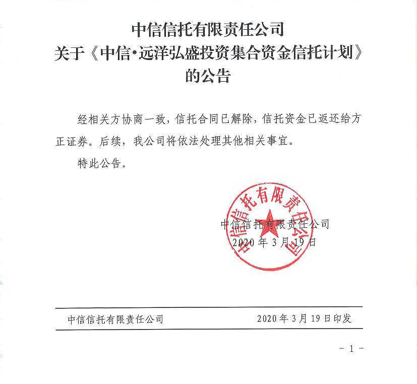 关于《方正证券股份有限公司关于中信·远洋弘盛投资集合资金信托计划风险事项的提示性公告》的公告