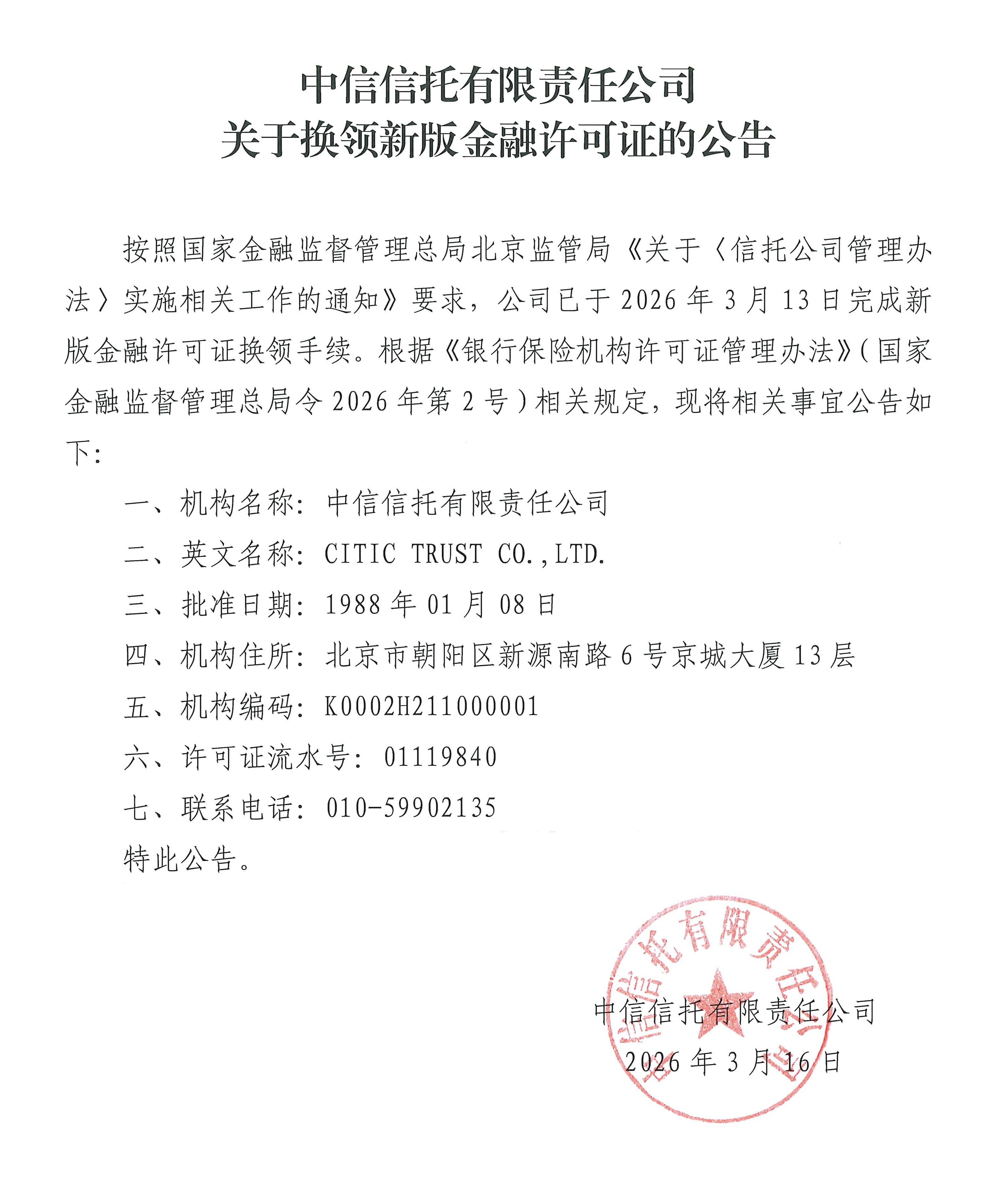 中信信托有限责任公司关于换领新版金融许可证的公告